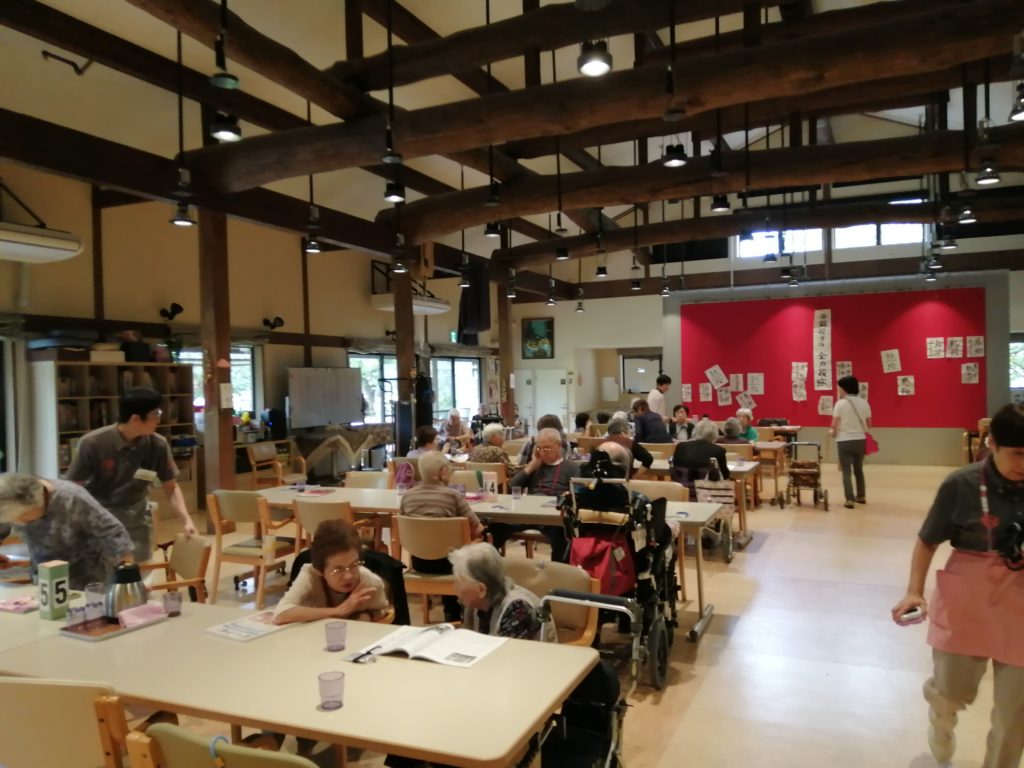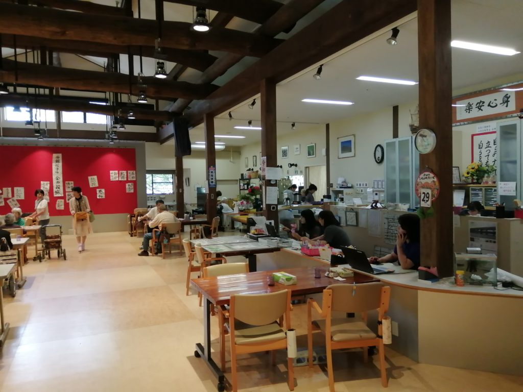 デイサービスの様子です。広いフロアに約50名ほどの利用者様がいらっしゃいます。
