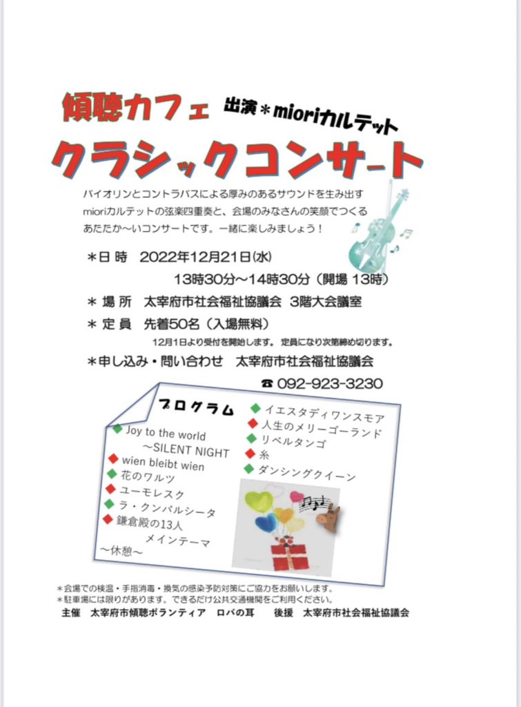 傾聴ボランティア「ロバの耳」クラシックコンサートの準備が整いました。